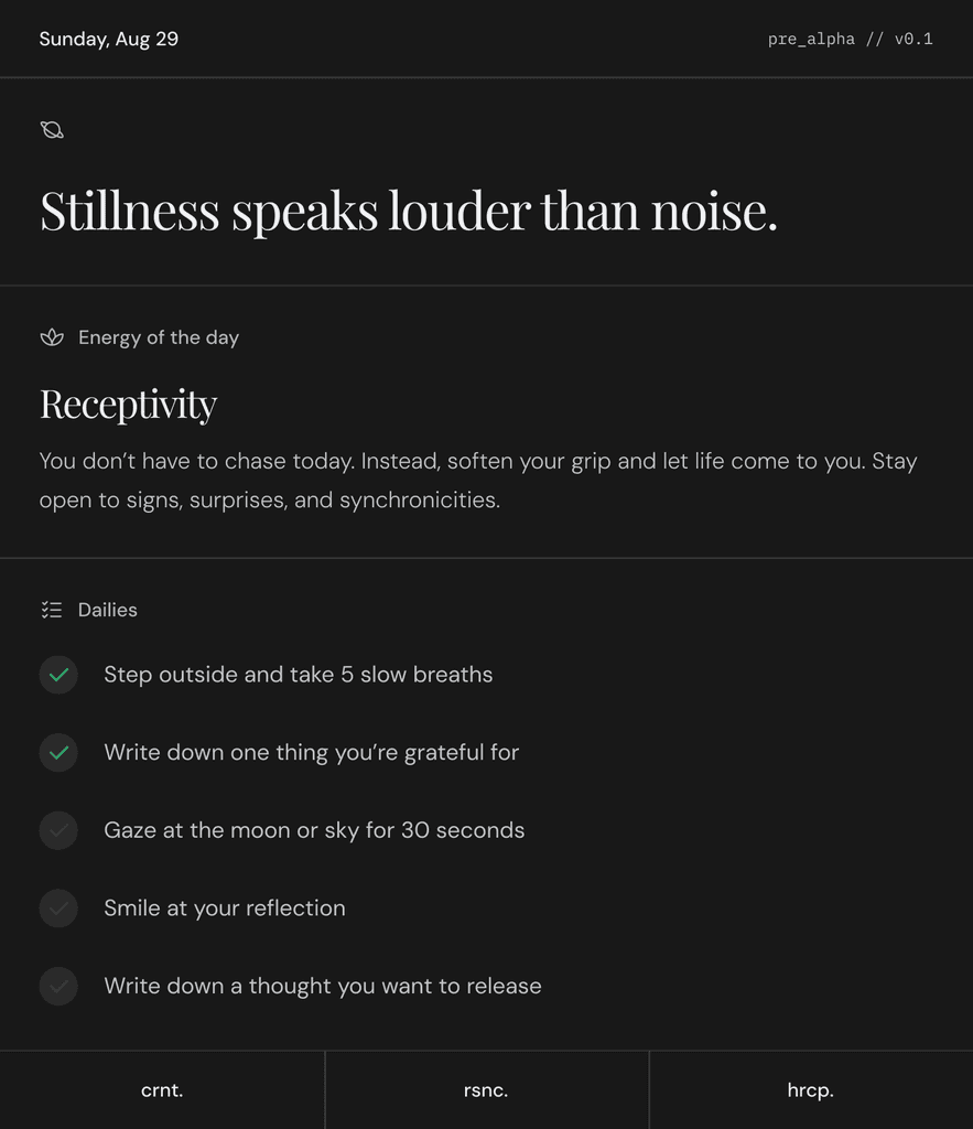 What started as a tool for my own well-being has grown into something I want to share with others. Serenity is for anyone who spends long hours on their computer and needs a gentle reminder to step back, reflect, or simply listen to something soothing. It’s a space where you can find grounding energy, daily inspiration, and mindful practices woven into your digital routine.